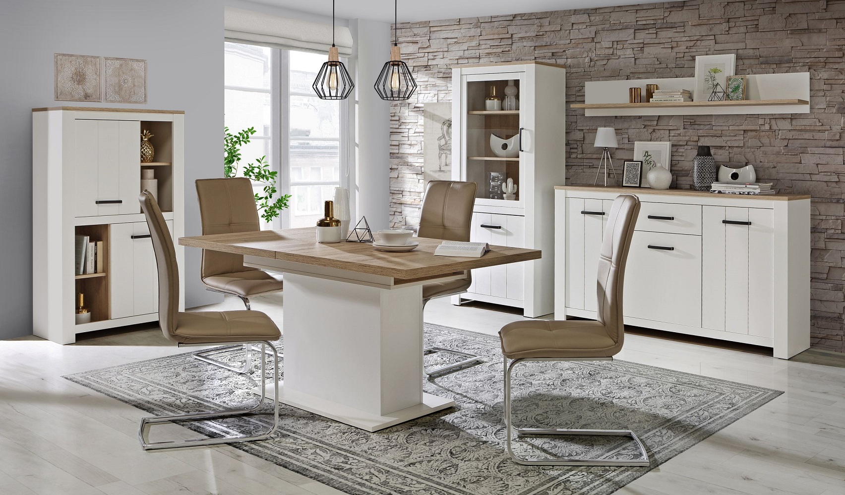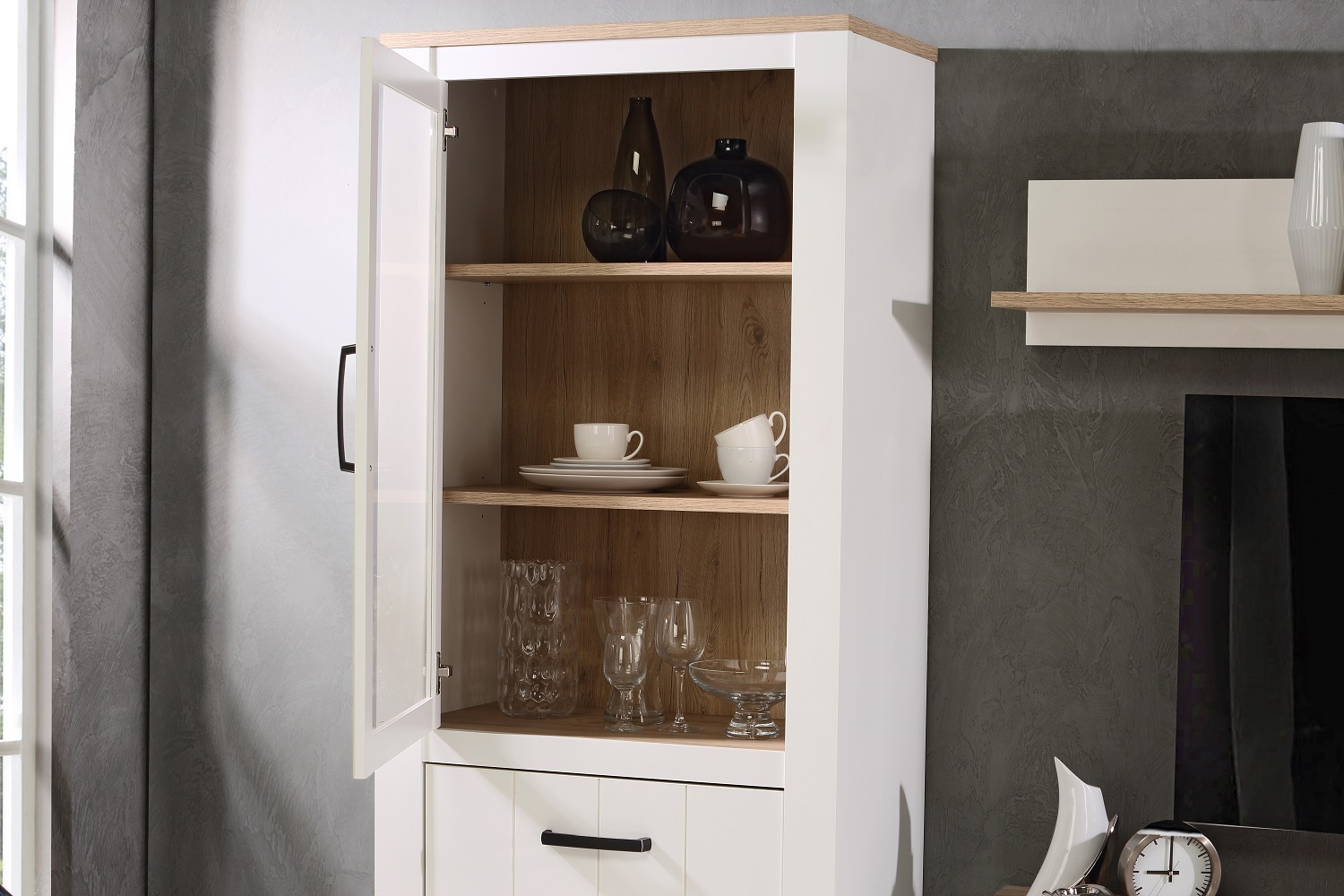 Vitrine Elara Matt Bianco Eiche Nb. Weiss Highboard Anrichte 1 Tür 1 Glastür