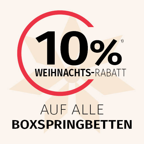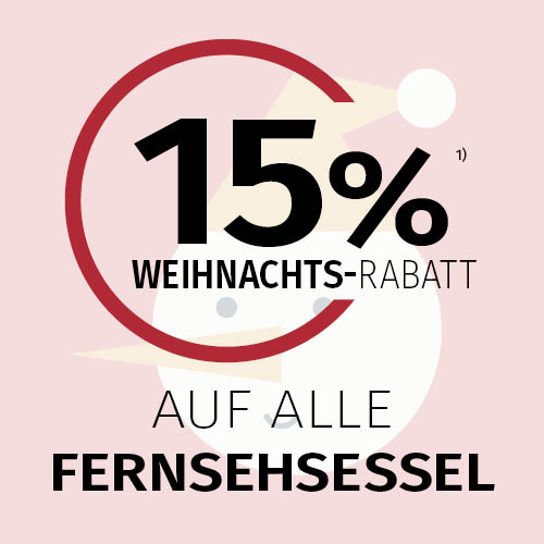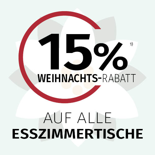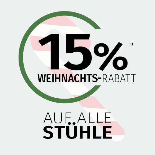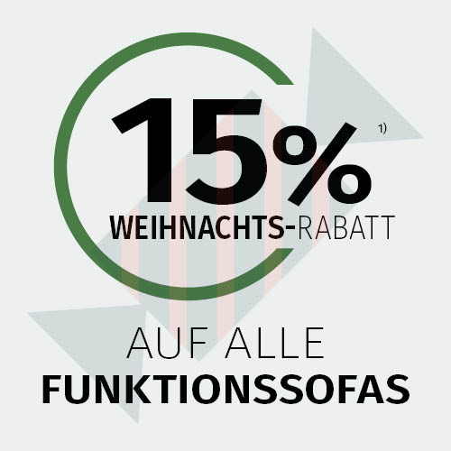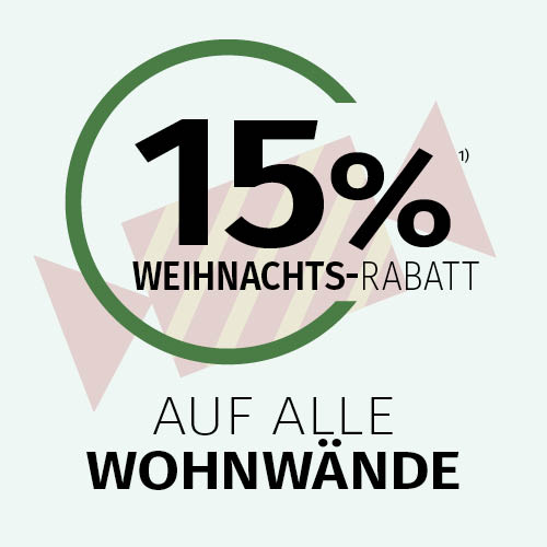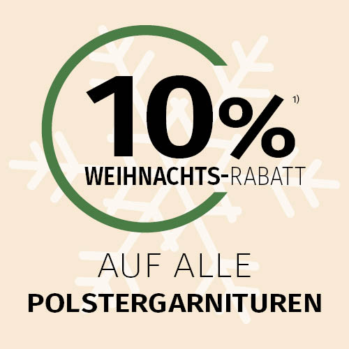 1) Gültig nur für Neuaufträge. Ausgenommen sind Artikel der Marken Joop, Stressless, CASADA und MDS-Modelle sowie in Prospekten beworbene, bereits reduzierten oder als Aktionspreis gekennzeichneten Artikel. Nicht mit anderen Rabattaktionen kombinierbar. Barauszahlungen nicht möglich. Aktion gültig bis 31.12.2025.
